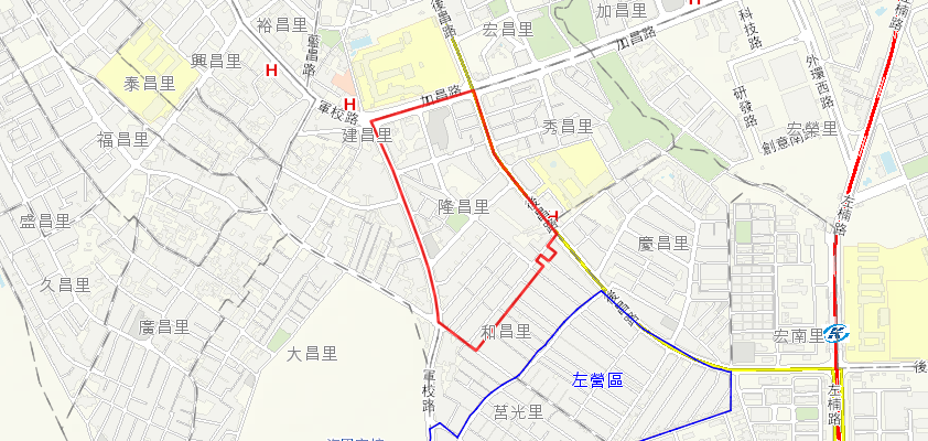 東至:後昌路七九七巷單號屋後之小巷弄與和昌里為界。 西至:加昌路與建昌里為界。 南至:軍校路及和光街一0九巷與建昌里、和昌里為界。 北至:後昌路與秀昌里為界。 |